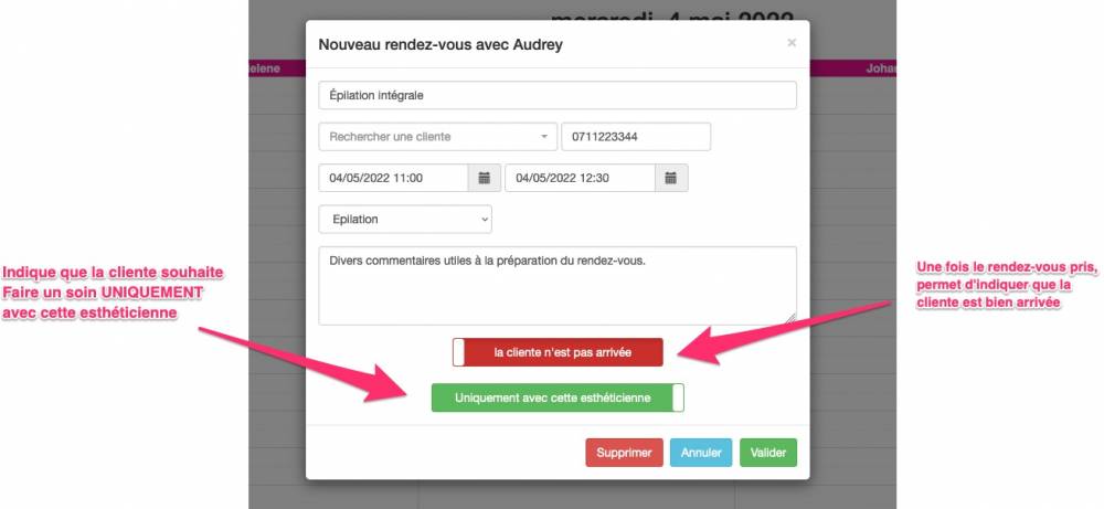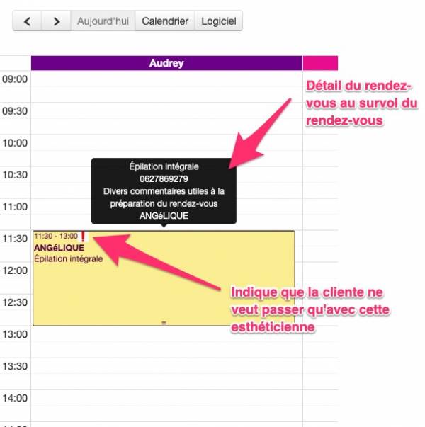 • Mettre un commentaire qui aide à préparer le rendez-vous avec des détails sur la cliente par exemple