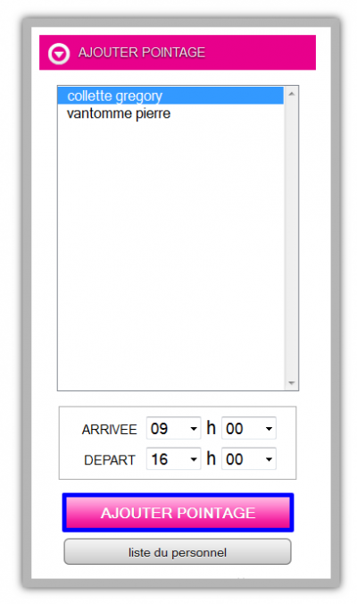 Afficher le texte sourceAnciennes révisionsLiens de retourAjouter au livre.Exporter en PDFHaut de page Share via Share via... Twitter LinkedIn Facebook Pinterest Telegram WhatsApp Yammer Reddit TeamsDerniers changementsSend via e-MailImprimerPermalien × Créateur de livres Ajouter cette page à votre livre Créateur de livres Retirer cette page de votre livre Voir ou modifier le livre(0 pages) Aide Pointage/Horaires Pour afficher le pointage il faut cliquer sur l'onglet “Pointage” présent dans le cadre bleu en bas de l'écran. Pour effectuer un pointage , sélectionner l'employé à pointer, sélectionner l'arrivé et le départ et cliquer sur “AJOUTER POINTAGE” pour valider. Tout les pointages créés sont rajoutés ici. /home/wiki/public_html/data/pages/employe_horaire/pointage_horaires.txt Dernière modification: 2015/08/10 16:12de epotam