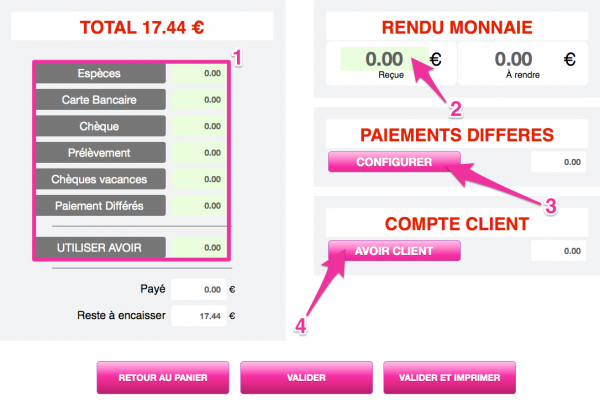 - Si le client possède un avoir positif, il est possible de régler en cliquant sur UTILISER AVOIR dans les moyens de règlement.