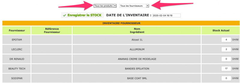 Vous pouvez filtrer par type de produits (cabine ou vente) et faire un inventaire global pour tous les fournisseurs ou par fournisseur.