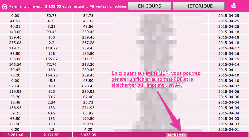 Enfin, l’icône représentant une imprimante permet de lister l'ensemble des paiements différés et d'en faire une impression.