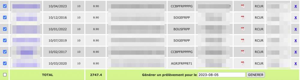 Par défaut, tous les prélèvements éligibles sont cochés.