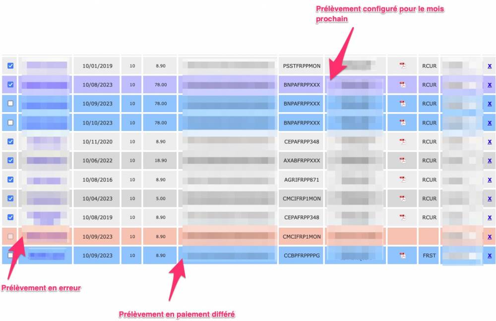 Les prélèvements du mois suivant sont affichés pour information en bleu, les prélèvements différés en violet et les prélèvements en erreurs sont en rouge. (Soit l'IBAN est incorrect, soit le BIC).
