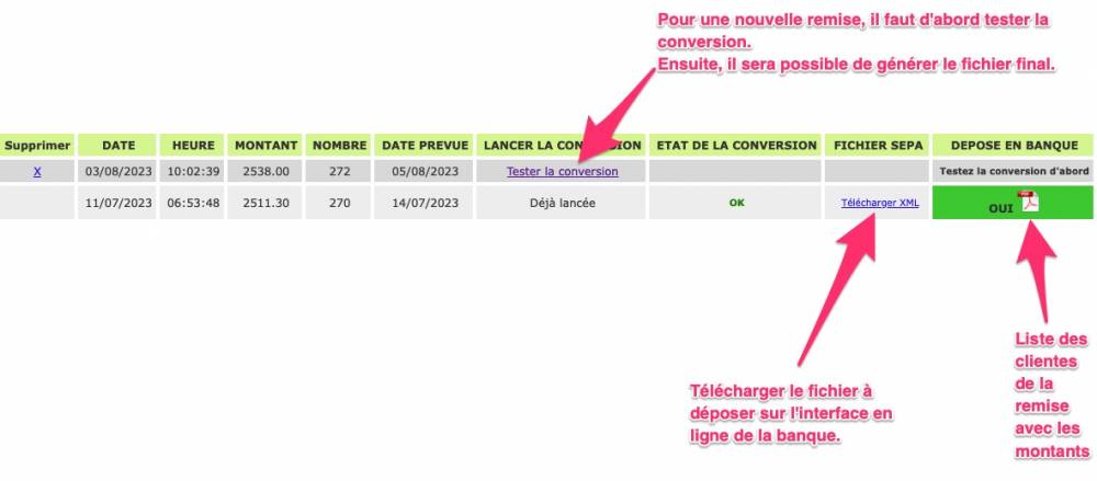 Une fois la remise générée, il faut télécharger le fichier XML et le déposer sur l'interface de sa banque sans tarder, car ce fichier contient les dates de prélèvements. Si vous attendez trop, il risque d'être refusé !