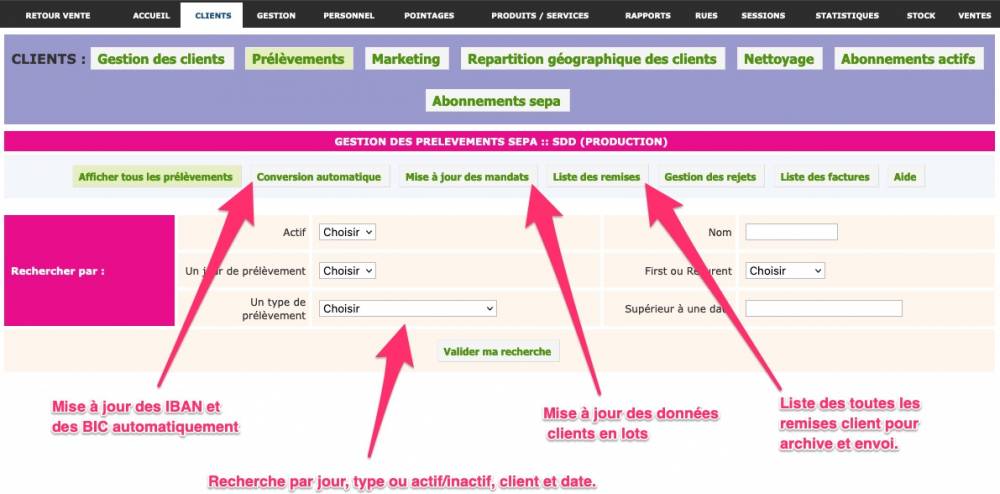 On retrouve sur cette page la liste de tous les prélèvements actifs. Sur la partie du haut, il est possible de faire une recherche fine selon différents critères que l'on peut cumuler :