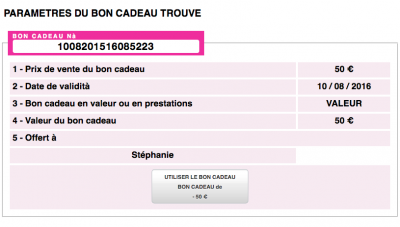 Une fois votre bon cadeau trouvé dans le logiciel, une page vous récapitule ses paramètres.